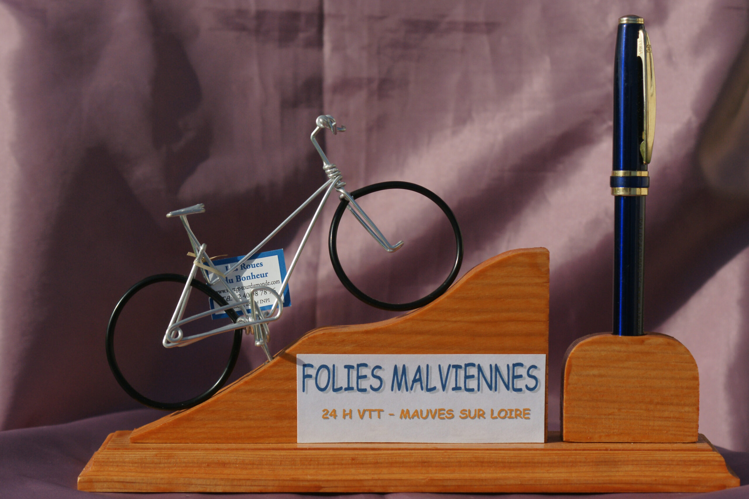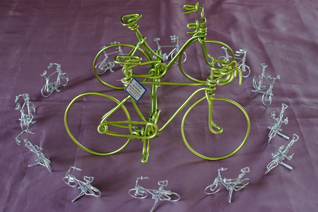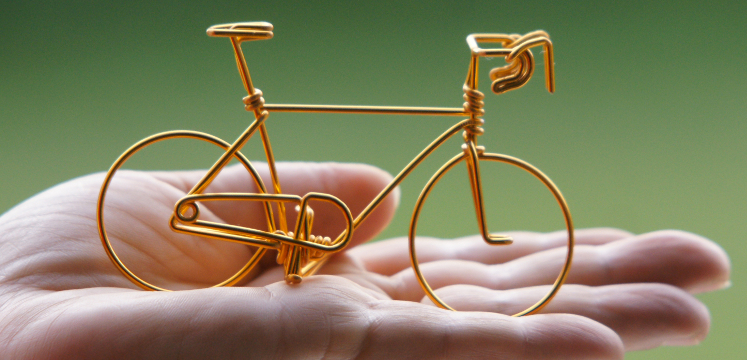 A votre demande, je réalise des créations artisanales de vélos miniatures faits main qui étonneront vos amis. Pour un mariage, le vélo-couple qui regarde dans la même direction est entrelacé par la béquille. Pour un vélo-anniversaire, je peux écrire l’âge en fil d’aluminium entre selle et guidon. Sur le vélo porte-mot, j’écris en fil un prénom ou un joli mot : amour, bonheur, tendresse, pardon, paix, merci… (Je n’écris pas les gros mots !) Découvrez également le vélo parure de bureau qui sert de porte-cartes de visite. Etonnez vos amis avec le vélo boucle d’oreille, le vélo lunettes… Pour les collectionneurs, vélo VTT ou vélo Rocky.
