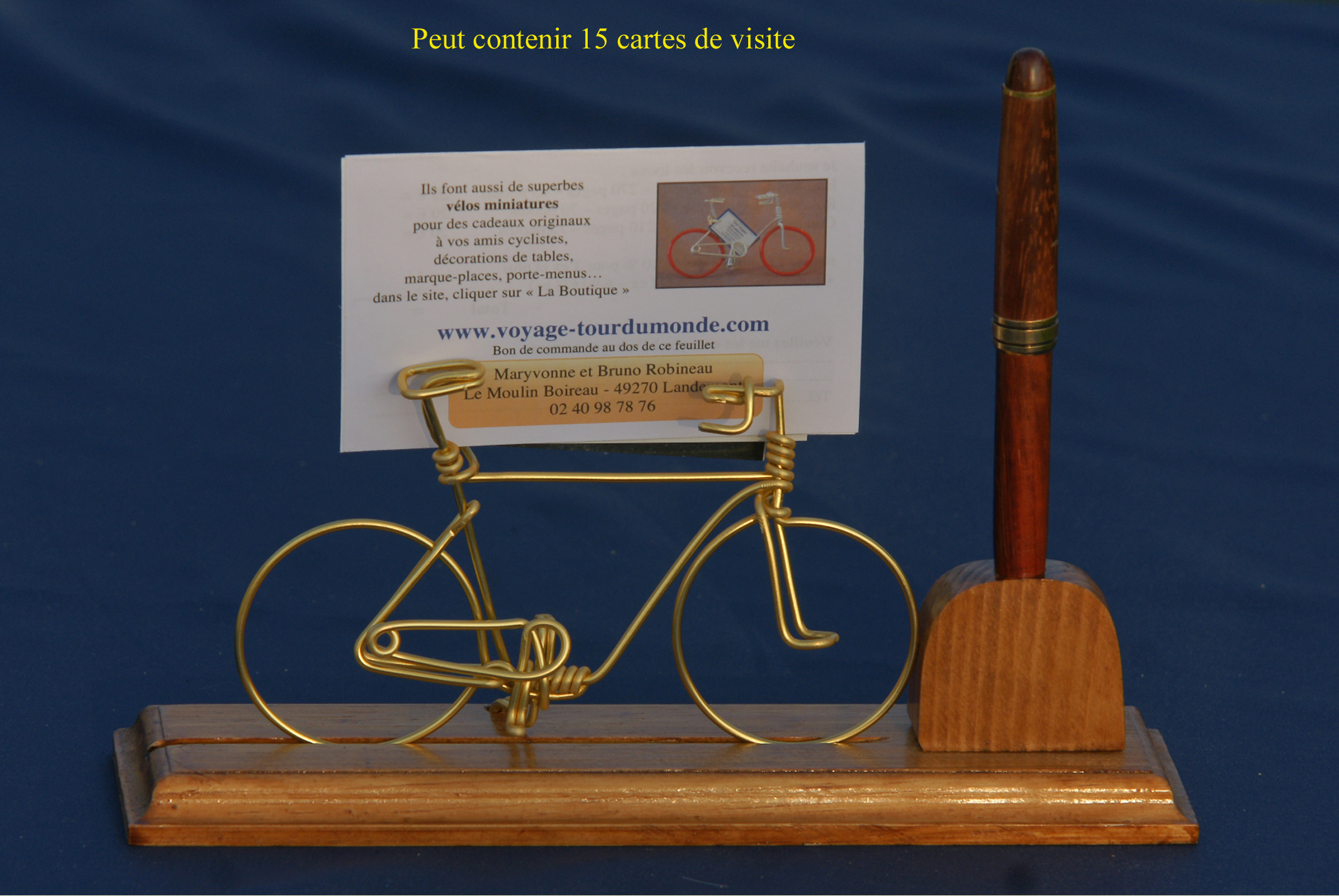 Dans ma vie de voyageur au long cours (dont huit ans autour du monde), j’ai fabriqué des petits vélos de toutes sortes que j’ai offerts aux quatre coins du monde pour remercier mes hôtes. Maintenant je mets à votre disposition mon savoir-faire artisanal de vélos miniatures faits main.