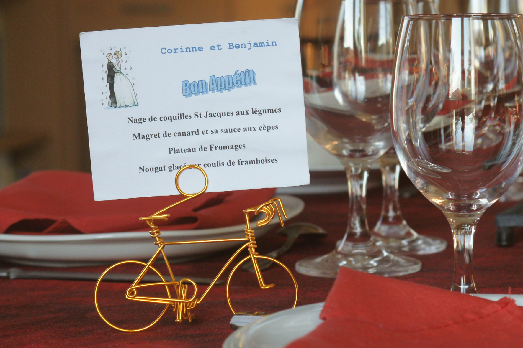 Pour que la décoration de vos tables de fêtes sur le thème du vélo à l’occasion d’un mariage, d’un anniversaire, d’un départ en retraite, d’une fête familiale, étonne et ravisse vos invités, voici les vélos miniatures : le vélo marque-place, le vélo porte menu, le vélo porte-dragées. Vos hôtes l’emporteront chez eux et le vélo deviendra alors souvenir de votre fête, en y glissant une photo de la journée. Des modèles un peu plus grands font un décor de table original (maxi-vélo ; vélo-couple) ; ils peuvent aussi orner le gâteau. Choisissez parmi 7 modèles différents.